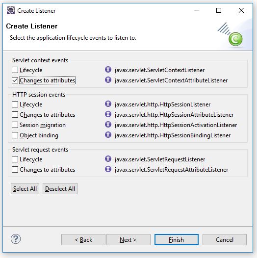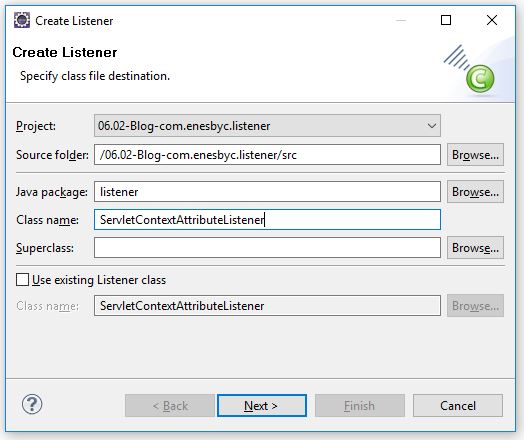 Burada hangi Listener’ları kullanmak istediğimizi seçiyoruz.Servlet Context içerisindeki Attribute’leri dinlemek istediğimizi belirtmiştik.Onu seçiyoruz ve Finish’e tıklıyoruz.