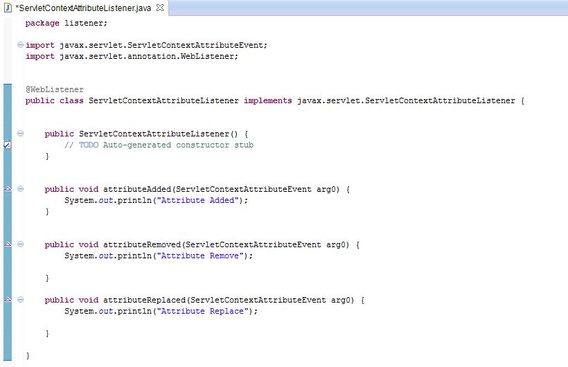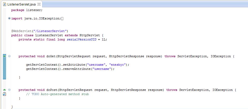 Karşımıza attribute silme , ekleme ve yer değiştirmesinde yapılacak metotlar geldi.Burada hangi işlemleri yapmak istiyorsak ona göre düzenleyebiliriz.Ben sadece konsola hangi metodun çalıştığını yazacağım.ListenerServlet dosyamızı oluşturalım ve Attribute ekleyelim ve silelim.