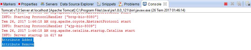 Projemizi çalıştırıp ListenerServlet’i çağırdığımızda konsol ekranında Attribute Added ve Attribute Remove yazdığını göreceğiz.Listener sorunsuz bir şekilde çalışıyor.Bir sonraki yazımda görüşmek üzere.